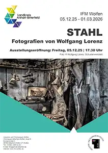 Die Ausstellung STAHL ist bis März 2026 im Industrie- und Filmmuseum Wolfen zu sehen. Weitere Infos finden Sie hier: Pressemitteilung | Ausstellung